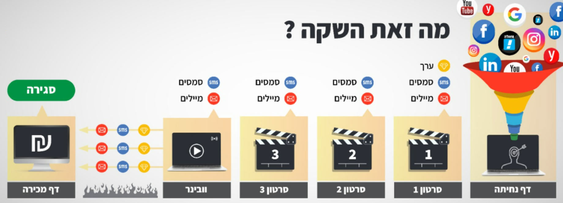הקורס הראשון מסוגו בארץ שמלמד כיצד לבנות את 7 סוגי המשפכים השיווקיים הכי נפוצים וחזקים שיש בעולם הדיגיטל!