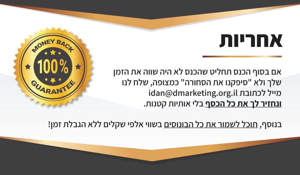 בנוסף, הבונוסים שאני נותן לך היום שווים גם הם אלפי שקלים, ותוכל להתחיל לקבל בעזרתם תוצאות מיידיות בעסק.